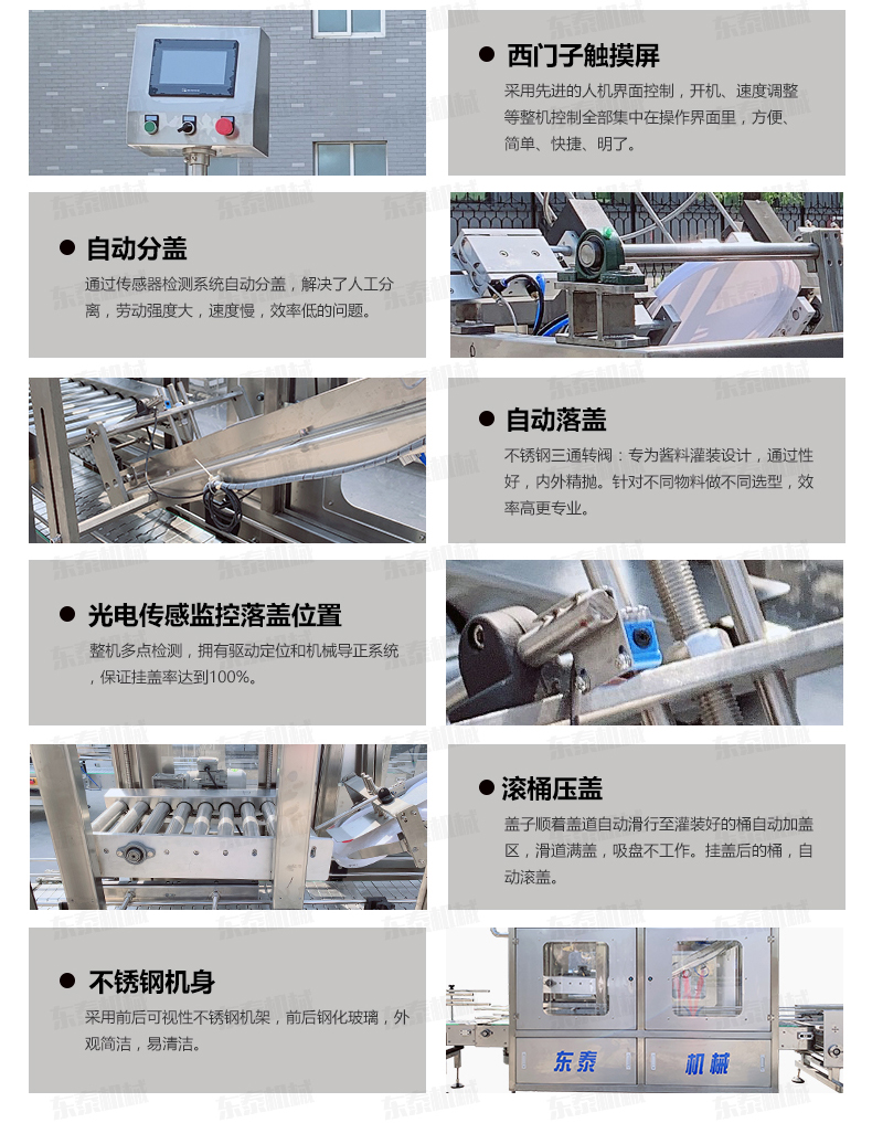 1.“自動(dòng)吸蓋”自動(dòng)控制系統(tǒng):整機(jī)多點(diǎn)檢測(cè),通過光電傳感監(jiān)控落蓋位置