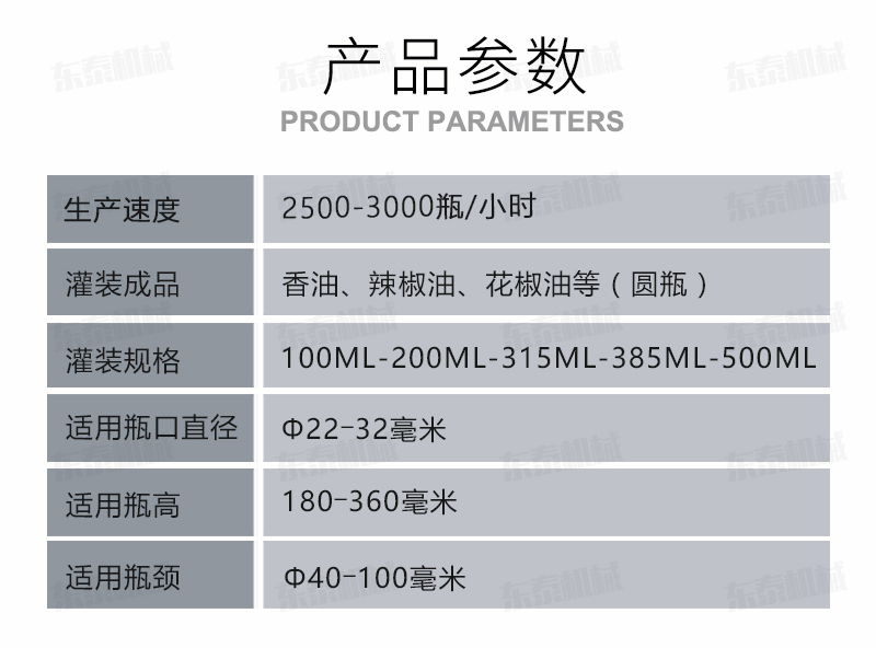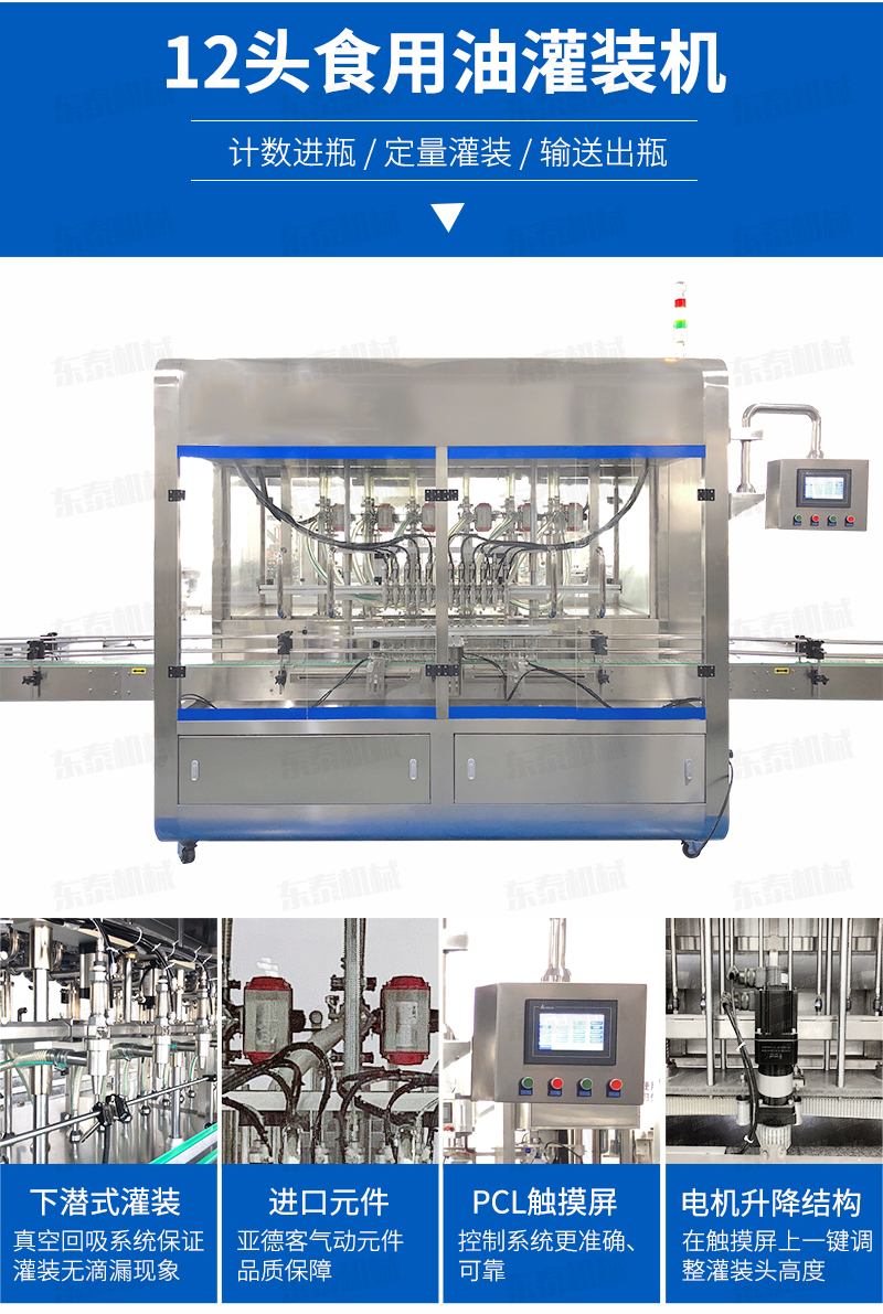 該系列灌裝機采用容積式計量灌裝原理,適用于各種規(guī)(100ml-1000ml)的南瓜籽油、榛子油、牡丹籽油、芝麻油、核桃油、山茶油、亞麻籽油、棉籽油、橄欖油、大豆油、玉米油、菜籽油等食用油灌裝。設(shè)備采用伺服驅(qū)動活塞計量,保證了 1‰的灌裝精度,在保證灌裝精度的同時,提高了 20%-35%灌裝速度,操作簡單,維護方便,節(jié)省人工成本,生產(chǎn)效率更高。