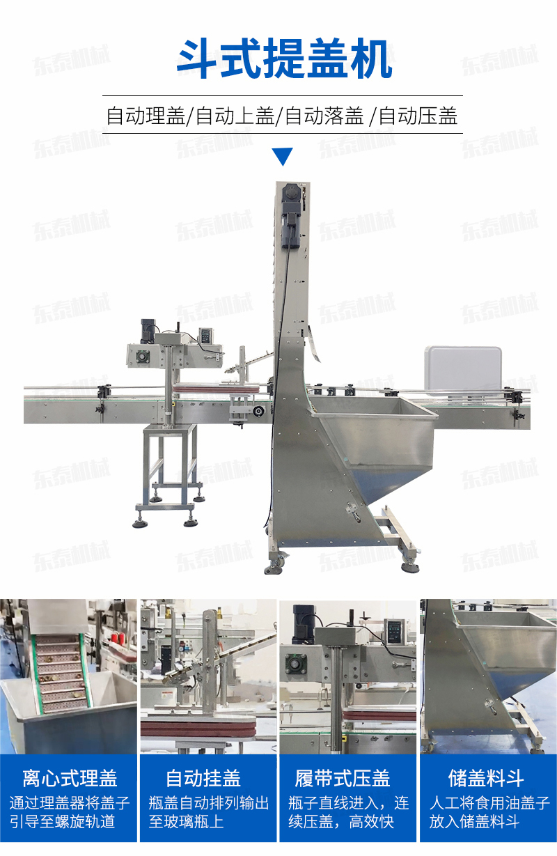 該提蓋式主要適用于制藥、食品、化工、日化等行業(yè),是自動化生產(chǎn)線中旋蓋機、壓蓋機等的理想配套設(shè)備。采用底部添蓋替代傳統(tǒng)的手動上蓋,使自動化工作更加方便、快捷。特別是對于要求不能有磨損的瓶蓋如印刷好后的蓋子需要到下一步工序生產(chǎn)或者包裝等,此設(shè)備也可強有效的減少磨損;其工作原理是通過微動開關(guān)檢測的作用,通過輸送刮板,把料斗里的瓶蓋按生產(chǎn)需要勻速的送入理蓋器中,確保了理蓋器內(nèi)的瓶蓋能保持在佳的狀態(tài);