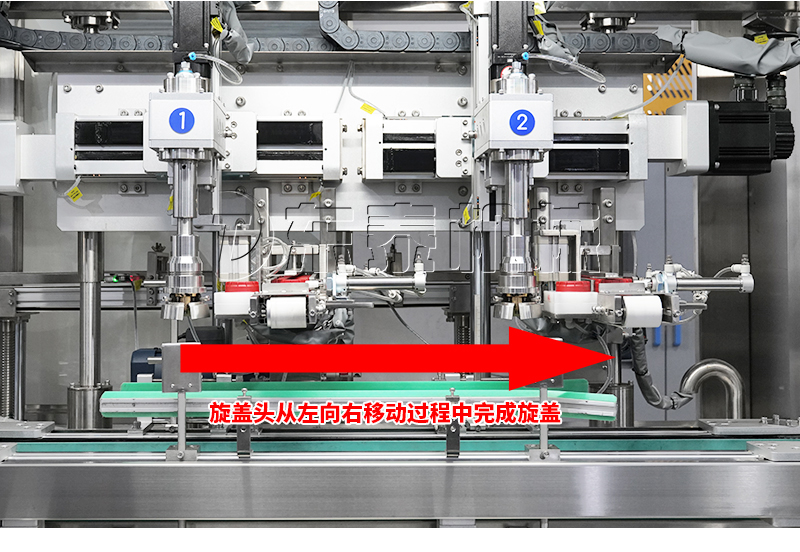 4、旋蓋(瓶子不停頓,抓具一邊跟著瓶子走,一邊進行旋蓋動作)