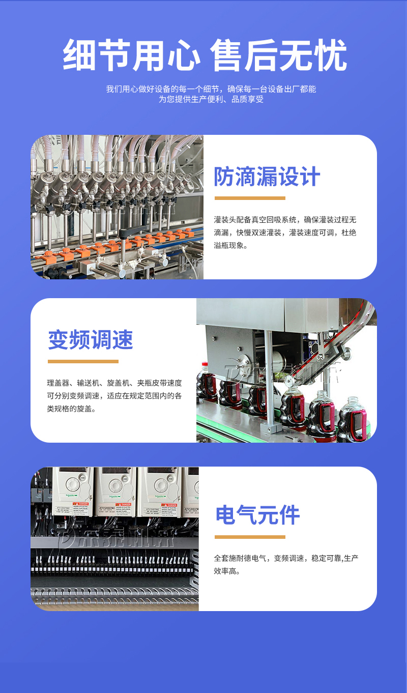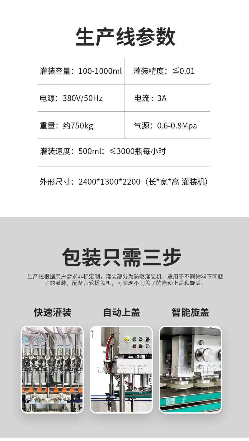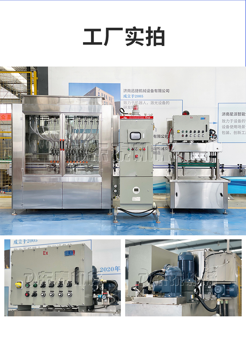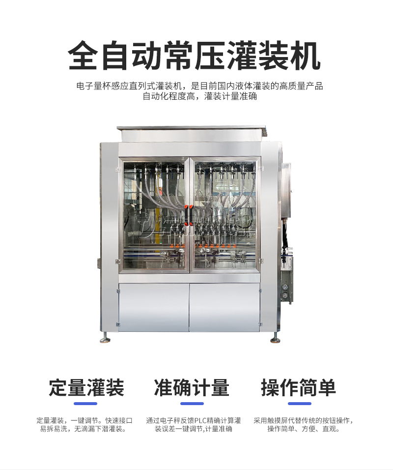 電子量杯感應(yīng)直列式灌裝機(jī),是目前國(guó)內(nèi)液體灌裝的高端產(chǎn)品,自動(dòng)化程度高,灌裝計(jì)量精確,適用于塑料瓶、玻璃瓶等各種幾何形狀的瓶型的不含氣體的酒水、飲料、調(diào)味品及其他溶液的定量灌裝。機(jī)器采用觸摸屏代替?zhèn)鹘y(tǒng)的按鈕操作,操作簡(jiǎn)單、方便、直觀?萍己扛。機(jī)器灌裝計(jì)量可通過觸摸屏對(duì)灌裝時(shí)間的調(diào)整實(shí)現(xiàn)不同計(jì)量灌裝,方便操作者使用。