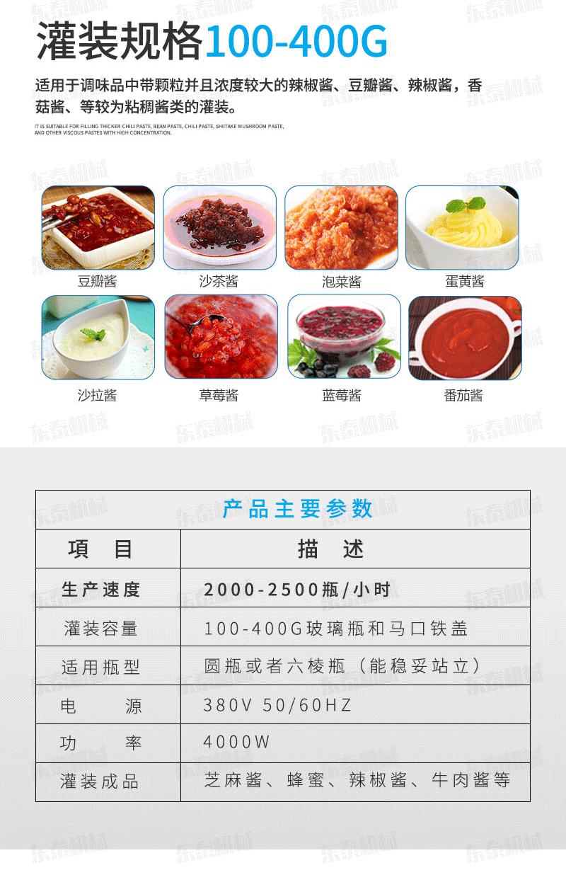 辣椒醬灌裝機(jī)采用活塞式灌裝原理,適用于調(diào)味品中帶顆粒并且濃度較大的辣椒醬、豆瓣醬、花生醬、香菇醬、果醬、牛油火鍋底料、紅油火鍋底料、蝦醬等較為粘稠醬類的灌裝。