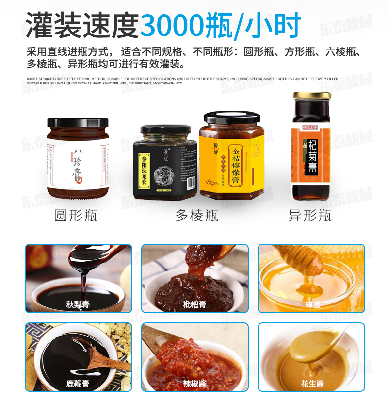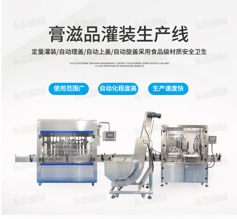 另外我們東泰公司可根據(jù)客戶自己的所需進(jìn)行選擇,公司主打產(chǎn)品有醬料灌裝機,自動灌裝機,液體灌裝機,灌裝生產(chǎn)線,等等設(shè)備提供個性化定制服務(wù),不僅能夠使膏體自動灌裝機更好的對產(chǎn)品實行包裝,也是對企業(yè)發(fā)展的一種責(zé)任,根據(jù)目前以快節(jié)奏為標(biāo)準(zhǔn)的社會市場來講,采用電腦控制的膏體自動灌裝機加工生產(chǎn)流水線灌裝準(zhǔn)確,精度達(dá)0.2%,這就給與膏體產(chǎn)品的生產(chǎn)幫了一個大忙。
