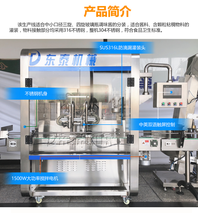 現(xiàn)在很多行業(yè)領(lǐng)域的發(fā)展方法都有了一定的更改,為了能使我們的使用者可以相對于企業(yè)擁有更加深入的了解芝麻醬灌裝機(jī)機(jī)械,不但是擁有完善的售后,還設(shè)有24小時的熱線電話,也完全打破了傳統(tǒng)的未來發(fā)展方法,展開了多渠道未來發(fā)展。芝麻醬灌裝封口機(jī)生產(chǎn)設(shè)備觸摸式操作彩屏,可顯示生產(chǎn)狀態(tài)、操作程序和灌裝方式、畫面目標(biāo)、操作簡單、維護(hù)方便,期間我們也不斷地提高瓶裝芝麻醬自動灌裝機(jī)械的性能選用直瓶進(jìn)瓶、出瓶,使充填功能得以擴(kuò)展,各種形狀的容器得到有效充填從而滿足社會發(fā)展,如果你也需要一款芝麻醬灌裝封口機(jī)生產(chǎn)設(shè)備,那就到我們東泰來看看吧!